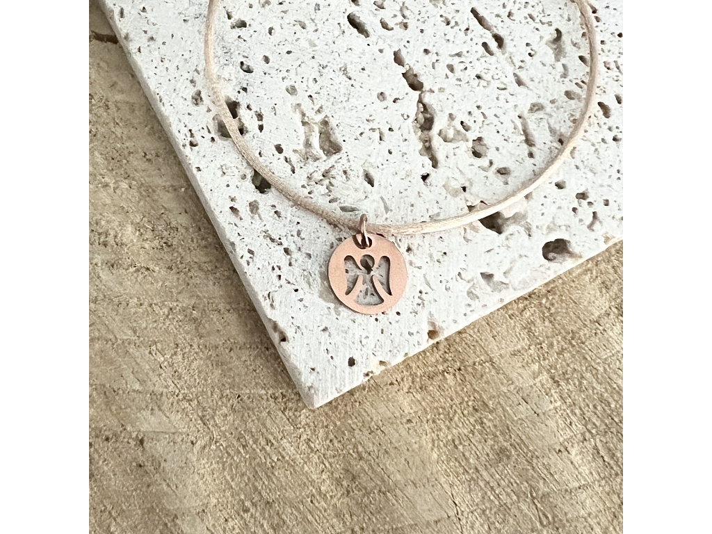 Na náramku je přívěsek navlečen na béžové saténové šňůrce