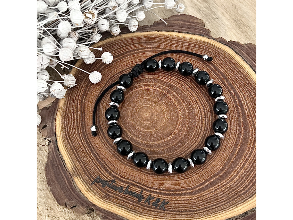 Černé korálky o velikosti 8 mm doplněné mezičlánky hematitu ve stříbrné barvě