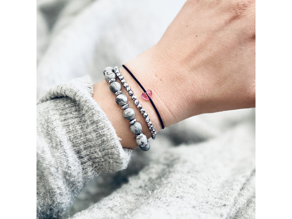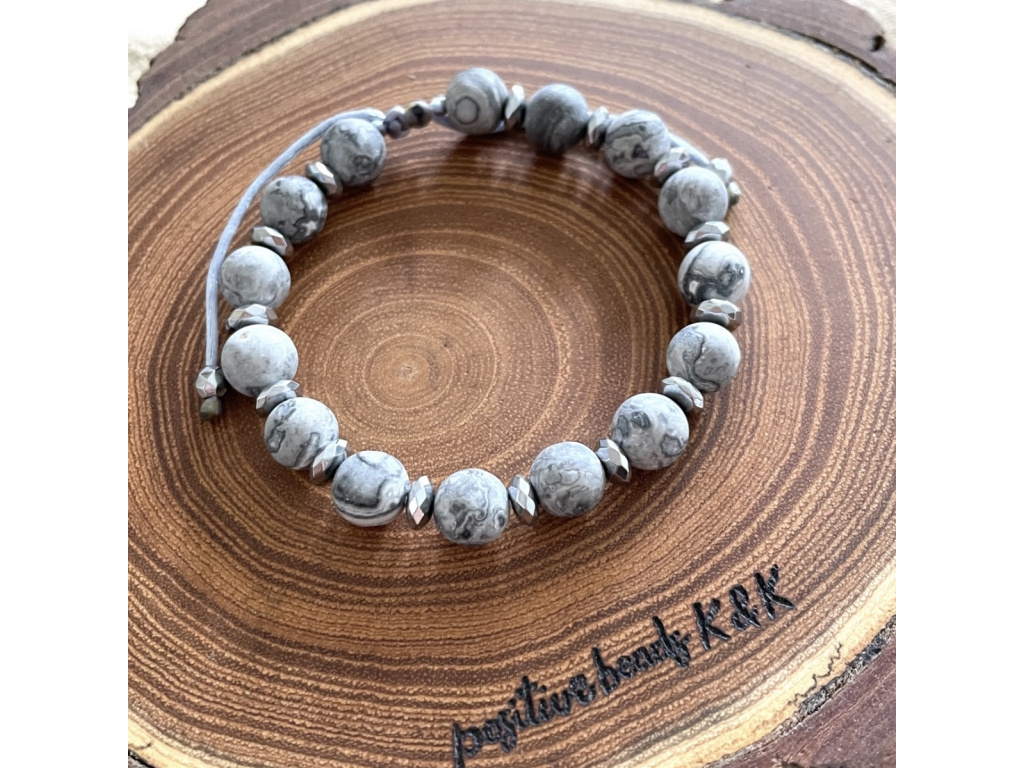 Šedý matný jaspis doplněný mezičlánky hematitu ve stříbrné barvě
