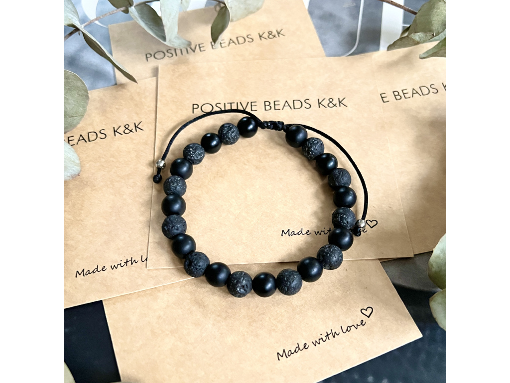 Lávový kámen je symbolem vnitřní síly, stability a ochrany. Vzniká z ohně a země, a právě proto je často spojován s odvahou a pevnou vůlí. Černé sklo dodává náramku moderní vzhled a jemný luxusní kontrast.
