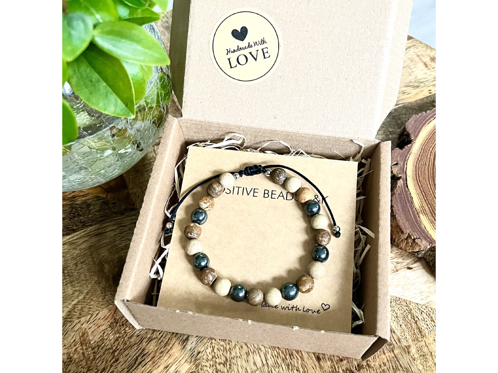 Stylový dárkový balíček pro muže, který ocení přírodní eleganci a hlubší význam šperku. Tento náramek kombinuje hnědý jaspis s hematitem a vytváří harmonický doplněk plný stability, síly a ochrany.