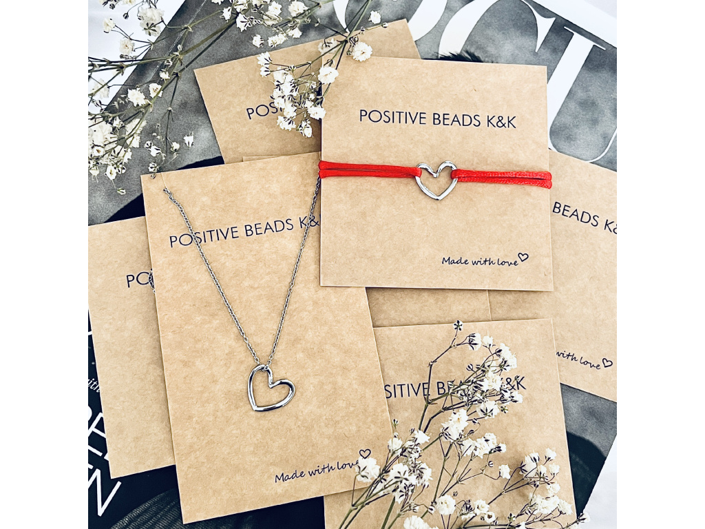 Jemný set šperků s minimalistickým motivem srdce. Obsahuje náramek na červené saténové šňůrce a ocelový náhrdelník s přívěskem ve stejném designu.
