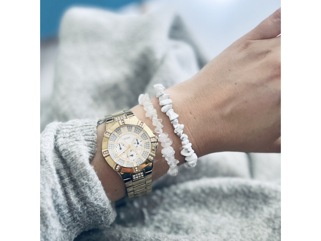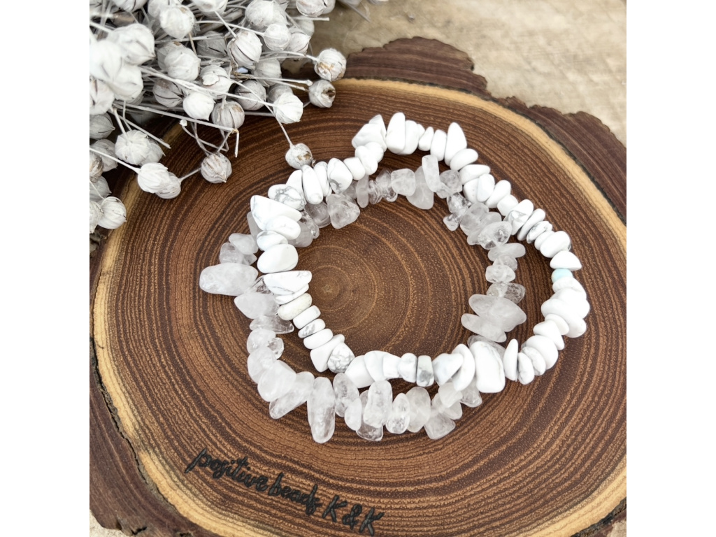 Dvojice náramků ze zlomků minerálů howlitu a křišťálu - propojená jemnou energií a čistou krásou.